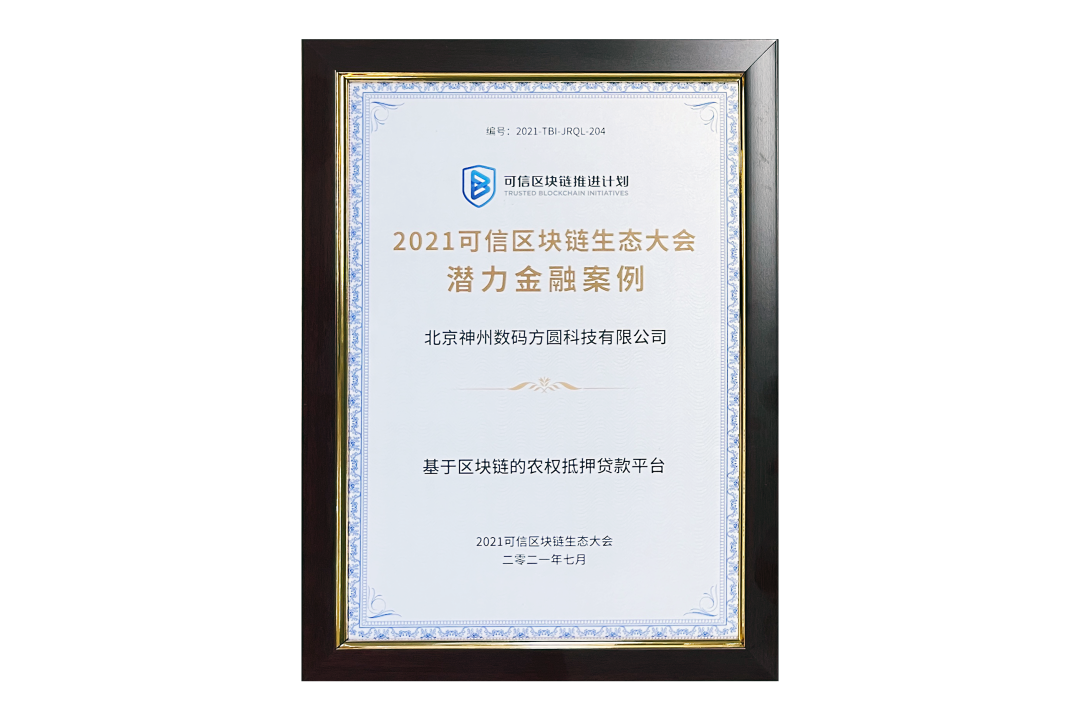 7月13日,由中国信息通信研究院、可信区块链推进计划主办的“2021可信区块链生态大会”在京举办,并隆重发布系列成果。神州信息子公司北京galaxy银河方圆科技有限公司(简称:神州方圆)推荐的“基于区块链的农权抵押贷款平台”荣获十大金融应用高潜力案例,为“区块链+农业”落地带来示范效应。
